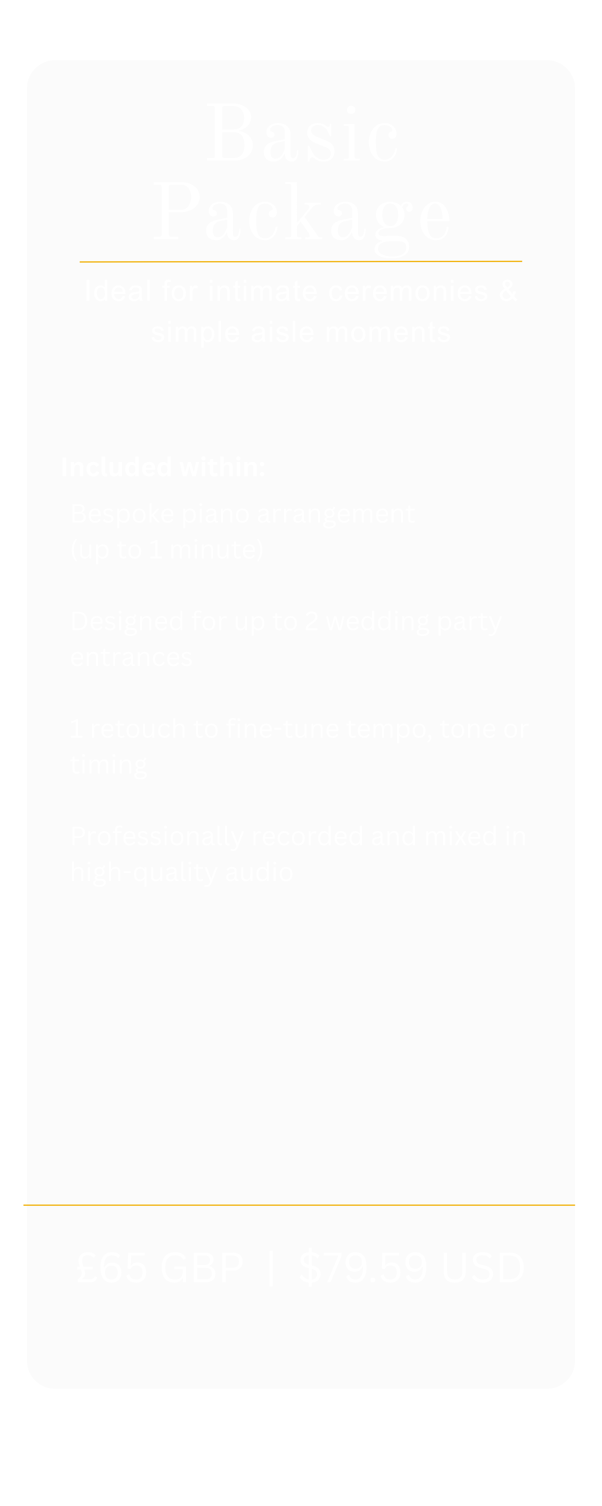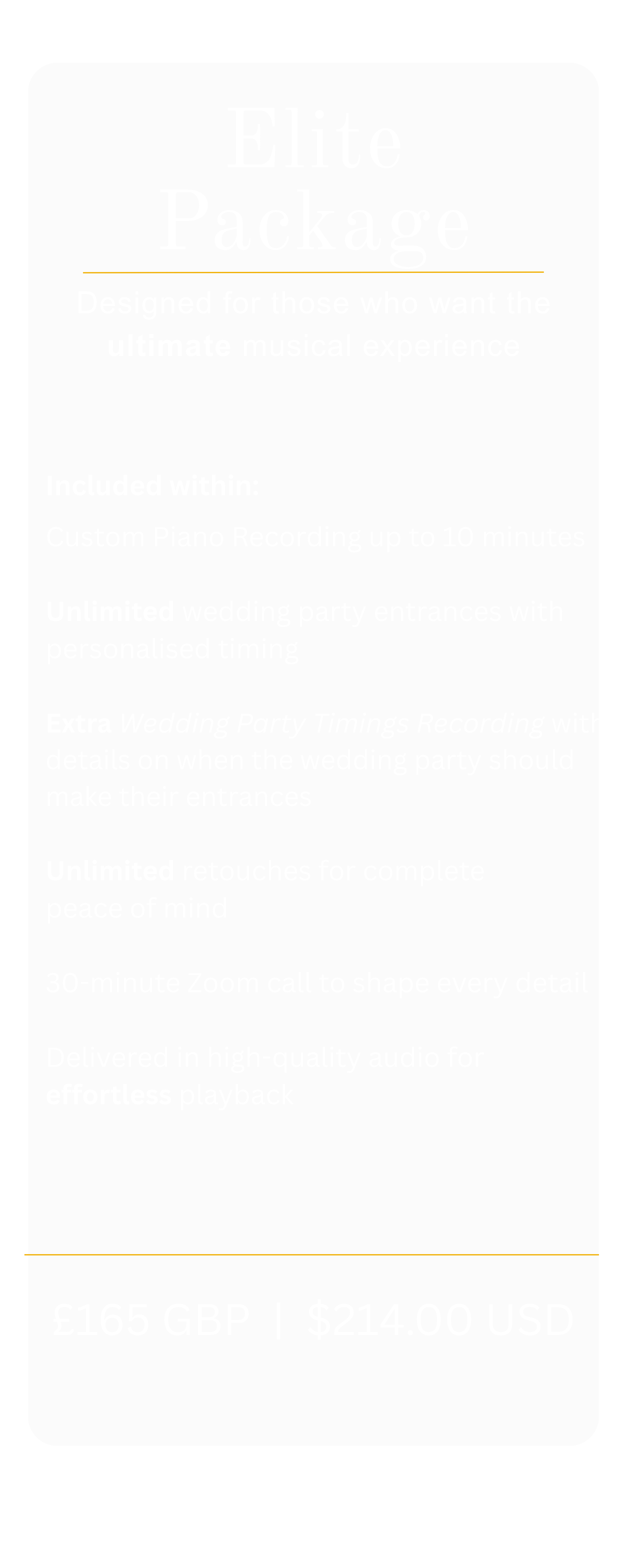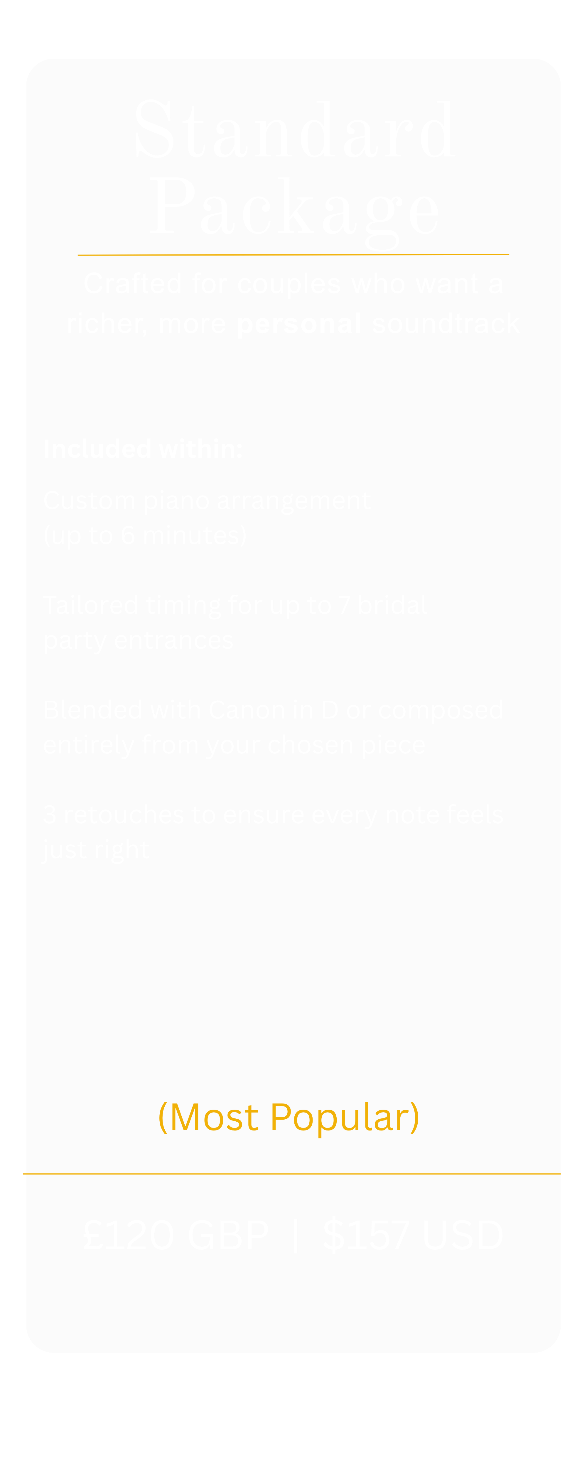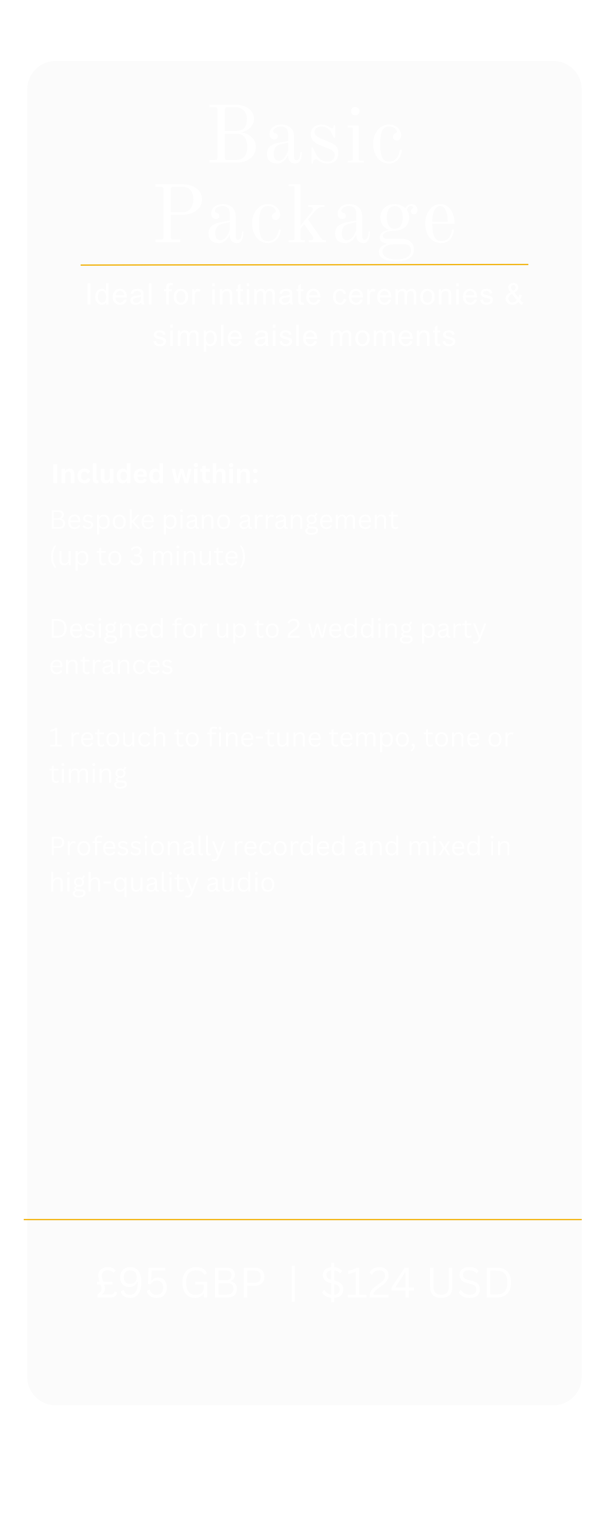 Our Custom Recording Packages deliver bespoke, hand-played piano versions of your favourite songs-professionally recorded and timed to your exact ceremony.