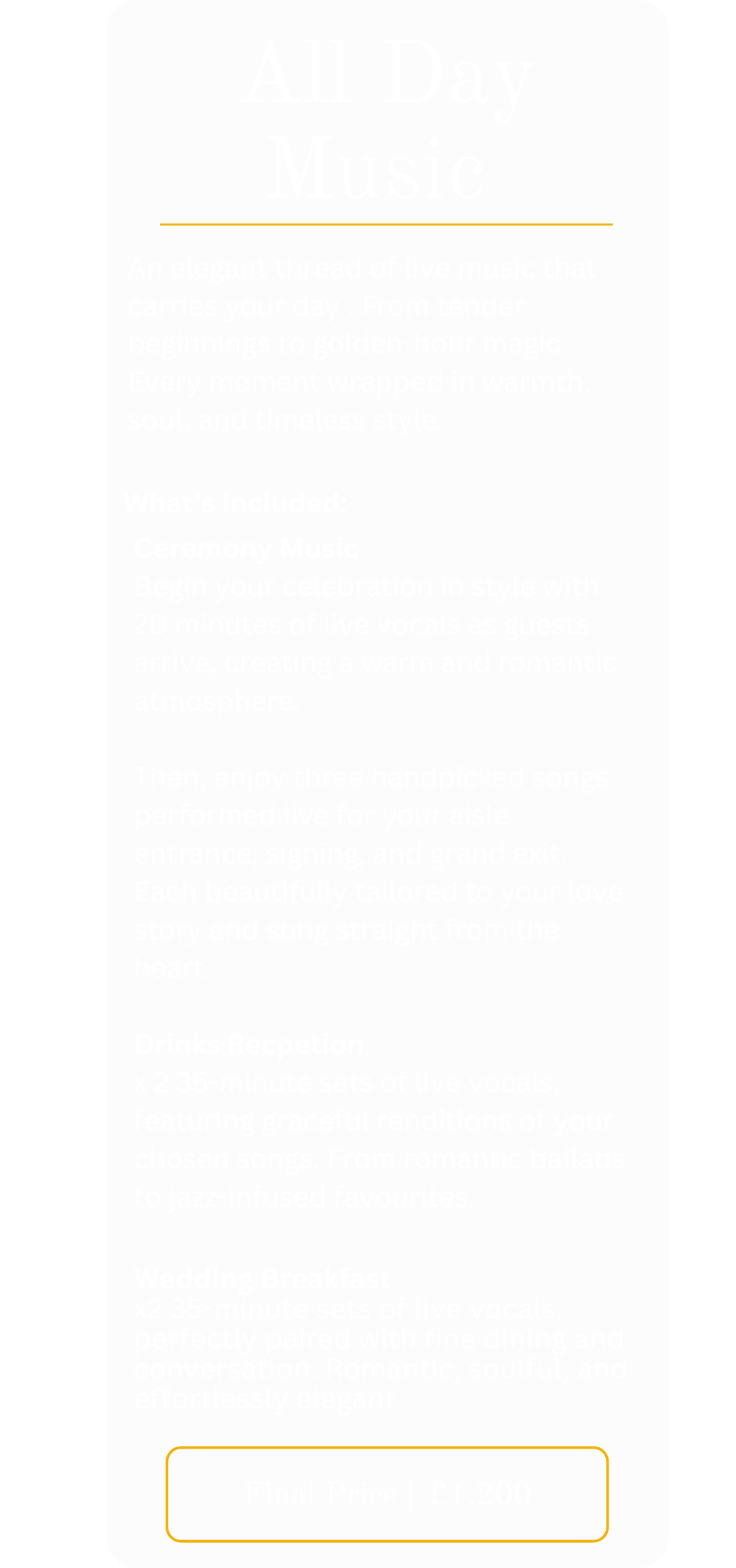 With a rich, versatile repertoire spanning pop, country, musical theatre, and beyond, our artists bring world-class vocals and heartfelt performance to every celebration. This isn’t background music, it’s the soul of your day, delivered with style, warmth, and grace.